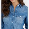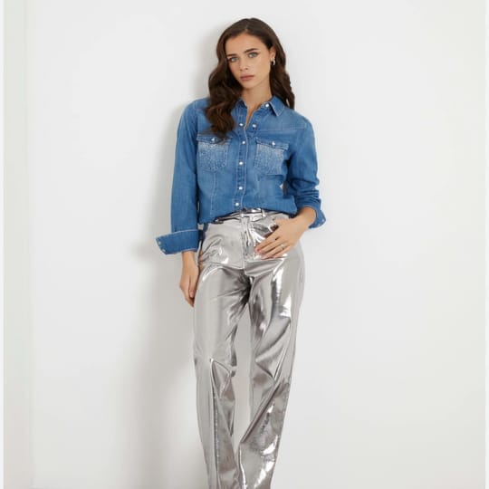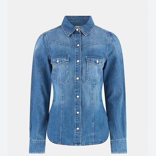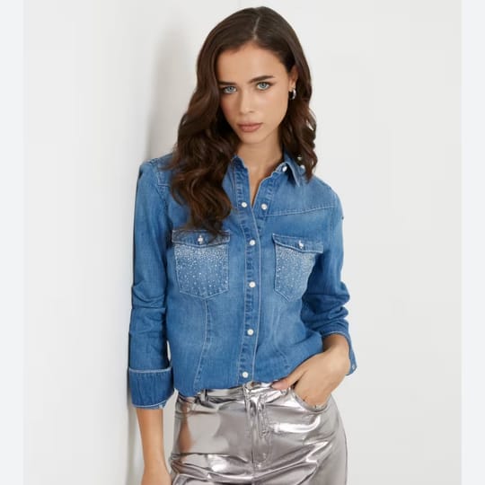 Риза деним, slim fit с блестящи камъни на джобовете